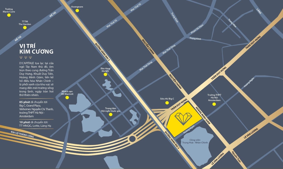 Khi nhắc đến d capitale trần duy hưng, điểm nhấn đầu tiên chính là vị trí địa lý đắc địa. Dự án sở hữu 3 mặt tiền đường lớn, giúp cư dân dễ dàng di chuyển đến mọi khu vực trọng điểm của thành phố.