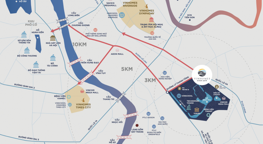- Tiếp cận hạ tầng hàng không: Từ vinhomes ocean park gia lâm, cư dân chỉ tốn 2 phút di chuyển ra Quốc lộ 5A để kết nối thẳng tới sân bay Quốc tế Nội Bài, phục vụ tối đa nhu cầu công tác và du lịch.
